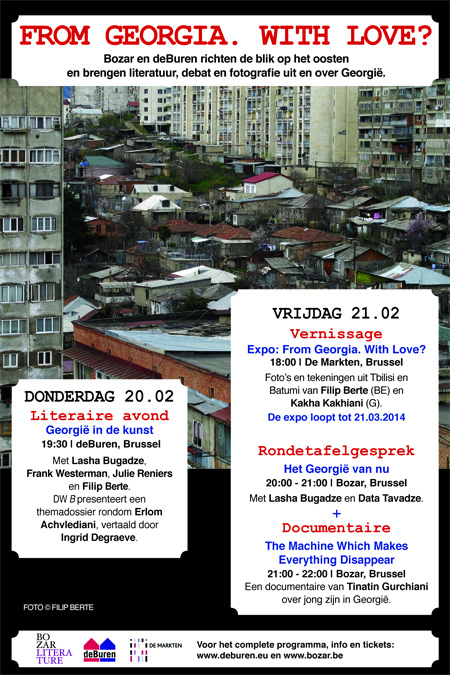 Nous avons le plaisir de vous annoncer - en coopération avec le Palais des Beaux-Arts - le projet « The Caucasus : from sea to sea ». La première édition de ce projet pluriannuel est consacrée à la Géorgie et l’Arménie avec, au programme, musique, cinéma, théâtre, littérature, photographie, tables rondes, colloque international consacrés aux aspects sociaux et politiques. Listons entre autres ces liens clickables : Exposition impressions du Caucase | Rétrospective de films | Soirée géorgienne | Sergey & Lusine Khachatryan play Brahms | Een avond rondom Georgië in de kunst | Exposition œuvres de Filip Berte (BE) et Kakha Kakhiani (GE) | Khatia Buniatishvili plays Ravel & Mussorgsky | Georgia today. The machine which makes everything disappear | The Gurdjieff folk instruments ensemble | Royal District Theatre Tbilisi : Women of Troy | Caucasus on film.