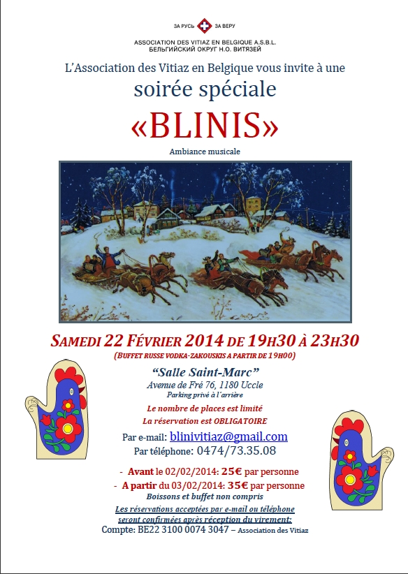 Mars 2014. Evénements à caractère culturel russe annoncésVifs remerciements à Maxim pour la superbe galerie photos-portraits, reportage imagé du bal russe 2014. Notons déjà le prochain bal Война и мир programmé en novembre à Paris. Nous sommes à nouveau comblés par les événements qui nous sont proposés en ce mois de mars 2014, et où l'âme russe est omniprésente. Outre les incontournables The Russian Soul, La Nuit des Etoiles et les concerts Julian Rachlin, notre petit coup de cœur se porte sur les concerts d' Alexander/Youlia et Lubov/Marie-Claude repris en illustration du présent billet. A l'affiche de ce mois de mars 34 événements dont entre autres : la série d'émission Splendeurs de l'ancienne Russie reprise par Arte+7, Match de rugby Belgique-Russie, Young Russian Talents, La nostalgie de l’avenir, The Moscow Trials, etc. Privilèges : Les inscrits au mailing vava.be bénéficient d'une réduction exceptionnelle de 50% sur les tickets d'entrée : au piano-récital Mogilevsky du 15 mars pour des pré-paiements impérativement réceptionnés avant le 5 mars ; à la conférence La Russie une terre d'opportunité pour les investisseurs ? du 18 mars.(A cet effet, le code d'identification personnel vava.be mentionné au bas du présent billet est requis pour la réservation!) Réponses :A notre regret rien encore d'enregistré en ce qui concerne les colonies de vacances.Aucune fête de Pâques de signalée à ce jour, si ce n'est au Club de Francfort (invitation en attente) qui célèbre au préalable sa Масленица ce 1 mars. [Notons que cette année tous les chrétiens fêtent Pâques à la même date le 20 avril 2014].Nos billets précédents sont maintenant archivés et peuvent ainsi être re-consultés.