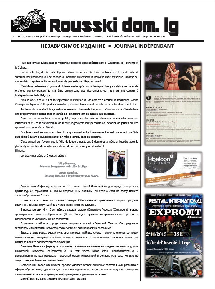 Olga Gritskevitch Независимое издание — Journal indépendant В Бельгии будет построен православный храм памятник жертвам Второй Мировой Войны Культурные параллели — Cultures parallèles Pétersbourg, Pétrograd, Léningrad, Saint-Péterbourg, par Pavel Goldshtein Les marionnettes liégeoises par Denis Fauconnier Пятый Всемитрный поэтический фестиваль « Эмигрантская лира-2013 ». Александр Мельник Это интересно — C'est intéressant Как провести каникулы в Льеже... и не только Моя история, Наталья Жоаким