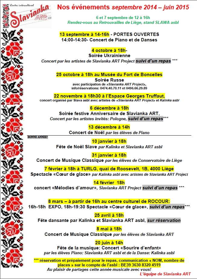 • Renseignements par téléphone : 0496 66 29 89 après 18 heures ou courriel : slavianka.art at hotmail dot com