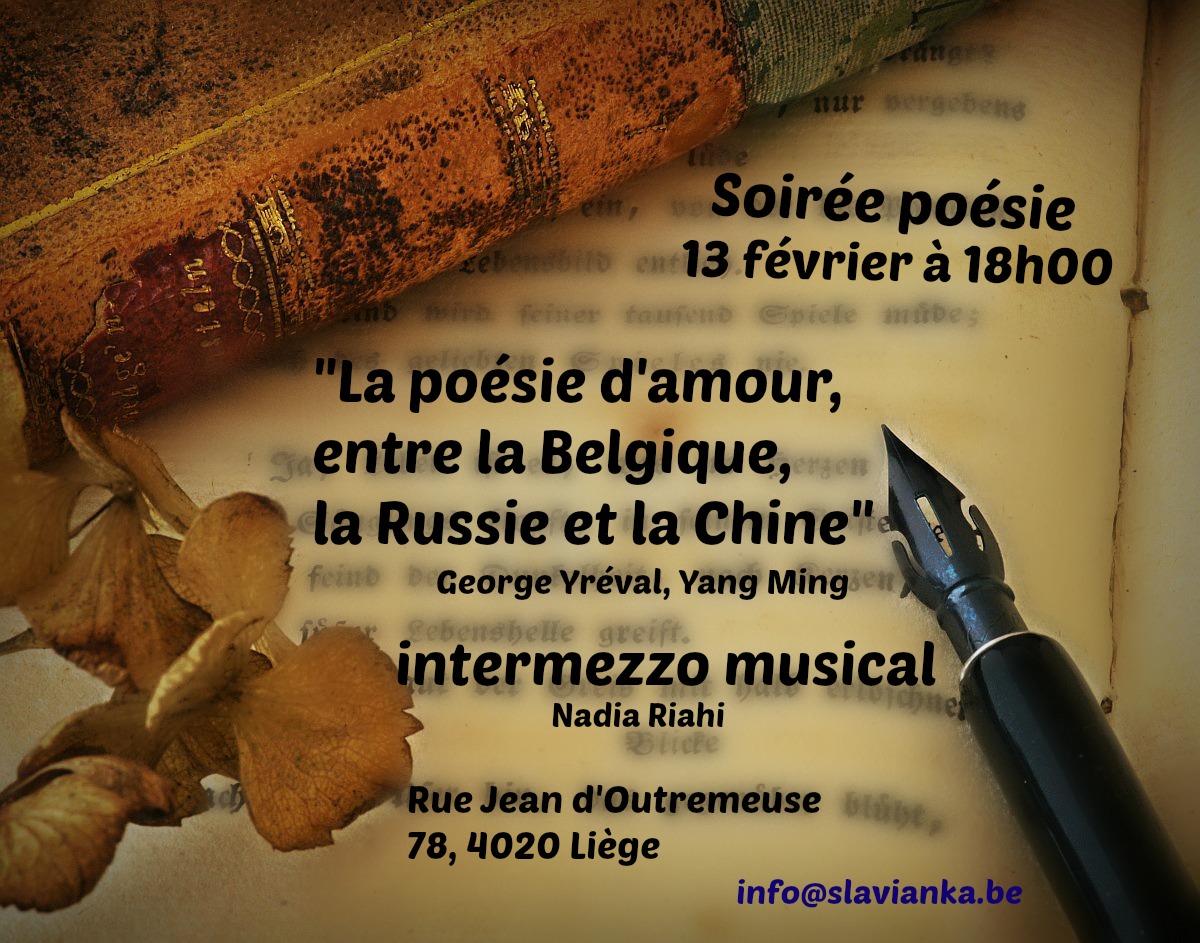 • 13 février à 18h - Soirée poésie. George Yréval, et Yang Ming « La poésie d'amour, entre la Belgique, la Russie et la Chine », intermezzo musical* ;