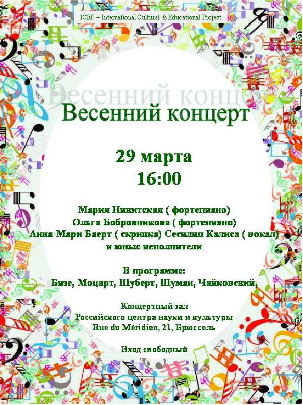 Бельгийское благотворительное общество « Ренессанс », при поддержке Российского Центра науки и культуры, а также проекта « La Ronde Musicale », рады пригласить Вас на благотворительный вечер « Твори добро" » который состоится в пятницу, 6 Марта, в лобби гостиницы « Aloft ».