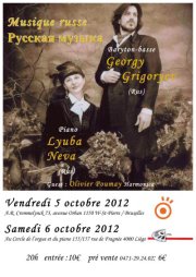 Георгий Григорьев (баритон) и Люба Нева (фортепиано) приглашают на концерт русской музыки. В программе прозвучат арии и романсы П. Чайковского, С. Рахманинова, М. Глинки, Н. Римского-Корсакова, А. Варламова... В концерте принимает участие Оливье Пумэ (губная гармошка). Le programme comporte des arias et des mélodies de Tschaïkovsky, Rachmaninov, Rimsky-Korsakov, Glinka, Varlamov... Invité Olivier Poumay (harmonica)