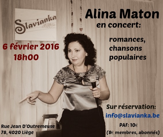 Nos événements en 2016 Centre interculturel Slavianka ART asbl Nouvelle activité : Atelier Théâtre avec Irena Snytko ; 16 janvier à 18h - Fête de Noël Slave, soirée festive des membres de l’association ; 6 février à 18h - Concert « Chansons par Alina Maton », romances, chansons populaires. Sur réservation : PAF 10€ (8€ membres, abonnés) ; 8-12 février - Stage « Matinée en musique », pour les enfants de 5 à 10 ans. Programme du stage ; 13 février à 18h - Soirée poésie. George Yréval, et Yang Ming « La poésie d'amour, entre la Belgique, la Russie et la Chine », intermezzo musical* ; 5 mars –à 18h Soirée VIP, Concert du groupe pop-folk franco-russe « Vesna », Sur réservation : PAF 12.50€ (10€ membres, abonnés) ; 19 mars à 18h- Soirée « À la croisée des cultures : Ukraine », au Centre laïque d'Angleur, place Andréa Jadoulle 14, Angleur, réservations : angleur.laicite at gmail dot com ; 16 avril à 18h- Concert « La Femme, L’Amour et l’Opéra », par Victoria Adams (Oksana Goncharuk). Sur réservation : iPAF 10€ (8€ membres, abonnés) ; 7 mai à 15h - Concours de piano pour le tout petits « Pia-pia-piano » ; 21 mai à 18h – Soirée festive « Vichivanka », broderie ukrainienne* : Vente de chemises brodées ukrainiennes, repas traditionnels ukrainiens, Dress code : porter une broderie ukrainienne, Sur réservation : PAF 30€ (25€ membres, abonnés) ; 4 juin à 18h Soirée VIP - Concert de Nicolas Martin, piano, http://www.nicolas-martin.com/ Sur réservation : PAF 10€ (8€ membres, abonnés) ; 18 juin à 18h - Concert « Nos talents », par l’atelier chant et cours de chant accompagnée ; 25 juin à 15h - Concert de Piano par les élèves de classe de piano. * animation par artistes de Slavianka ART Project Au plaisir de partager cette année musicale avec vous! Dimitry, Anna, Valéry, Helena, Nadia, Adèle, Alina et Sacha pour l’équipe de Slavianka ART, nka