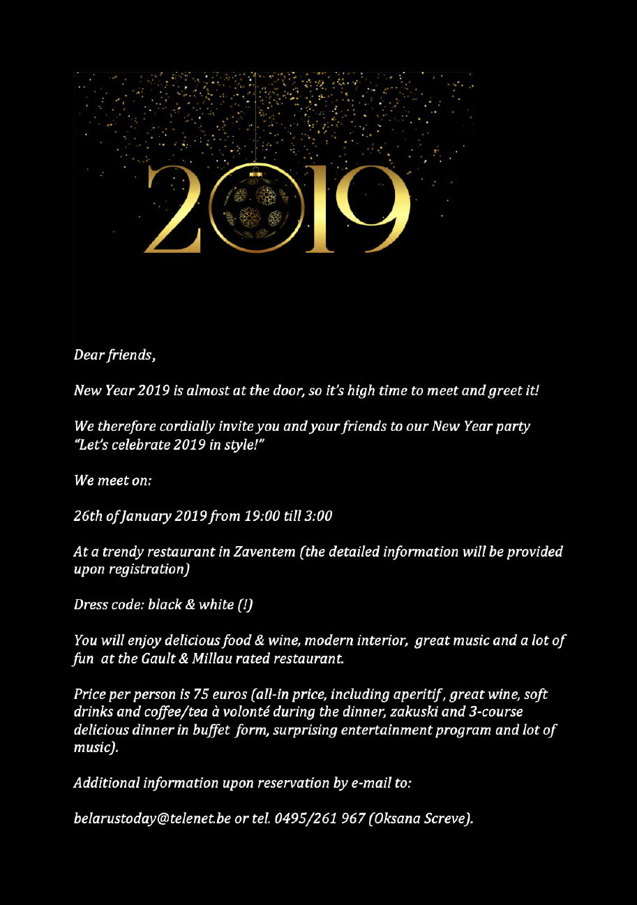 31/12 => Новый год в Мехелене (Mechelen) 31/12 => Празднование Нового Года 2019 (Gent) 4-13/1 => Concert Elim Chan. Shostakovich (≠ lieux) 1-8/1 => Expo Kids of the world (Villers-la-Ville) 5/1 => Het Zwanenmeer (Brugge) 5/1 => Noël russe en Normandie (Évreux) 12/1 => Concert magie Noël (Paris) 12/1 => Nouvel An Russe (Paris) 12/1 => Old New Year among friends (Saint-Josse) 12/1 => Russes temps des Tsars (Tervueren) 12/1 => Nieuwjaarsklanken 2019 (Menen) 12/1 => Russian Old New Year (Den Haag) 12/1 => Taalcarrousel (Antwerpen) 12/1 => Автобусная экскурсия (Allemagne) 12/1 => Рождественская Ёлка (Antwerpen) 12/1 => Рождественская Ёлка (Paris) 13/1 => Nouvel An Cosaque! (Paris) 13/1 => Что в имени твоем? (Bruxelles) 13/1 => Сольный концерт ЧИЖ (Amsterdam) 16/1 => Het Duel : Tsjechov (Delft) 16-20/1 => Bridges, East of West Film Days (Bruxelles) 16-18/1 => Stage Siberian Cossack (Fayt-lez-Manage)