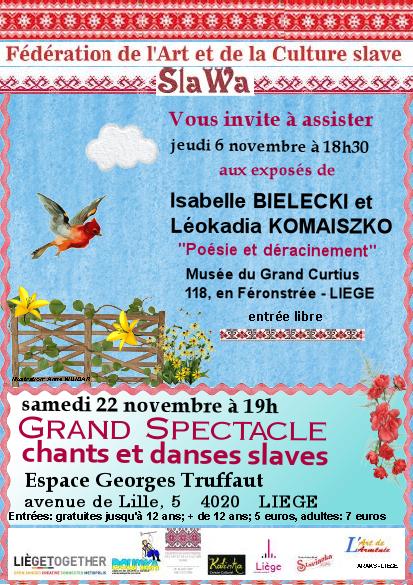 October 2014 : Calendrier d'événements relatifs à la culture russe.Voici le lien vers la liste des 53 événements culturels déjà enregistrés pour ce mois de novembre 2014. Notons que décembre rassemble déjà 21 annonces et l'année 2015 en compte 31. Impossible donc de tout citer dans ce texte! Ne nous en tenez pas rigueur. Alors que la troupe Koukouchechka de Bobrouisk poursuit sa tournée, Julietta propose déjà une petite soirée en chansons ce 7 novembre au Sans Interdit. Nous avons été ravis d'assister au tout premier concert donné par sa toute nouvelle asbl Triomphe de l'Art et dont Radio-Rubel a assuré le reportage. Le lendemain 8 novembre « Parfum d’Ambre » nous invite à son double événement qui met l'âme slave à l'honneur. Nous aimons annoncer les concerts parisiens de Natacha ainsi bientôt son Récital Fusion puis Sainte-Cécile. Nos amis liégeois nous offrent une soirée russe au musée du Fort à Boncelles, tandis que Halinka nous revient à Bruxelles avec son expo « Détails pierre - bronze ». Enfin, ne rater sous aucun prétexte le 28 novembre le prestigieux Gala « Patrimoine Russe » au Château du Lac à Genval ainsi que le 25 novembre la petite prestation de notre chorale « Rossa i Nota » en l'Eglise Sainte-Alix de Woluwé-Saint-Pierre. | |