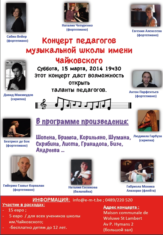 Je suis heureuse de vous inviter à mon prochain Concert-Resto musical « Piano-improvisé » tenu dès 20 heures les vendredi 21 et samedi 22 mars 2014 au Resto Vintage à Bruxelles. Cet événement est dédié à l'anniversaire des deux mois de mon fils Oscar. Le programme musical sera aussi varié qu'impressionnant. Nos interprétations musicales iront dans tous les sens du classique au jazz, de la chanson française à l'improvisation sur les des thèmes populaires. Artistes de la soirée : Lubov Barsky, pianiste, improvisateur, auteur d'arrangements pour piano et compositions personnelles, lauréate de concours internationaux de piano en Italie, Espagne, Israël et Pologne. Marie-Claude Hurter, chanteuse alto, auteur de poèmes musicaux sur la musique de Rachmaninov.