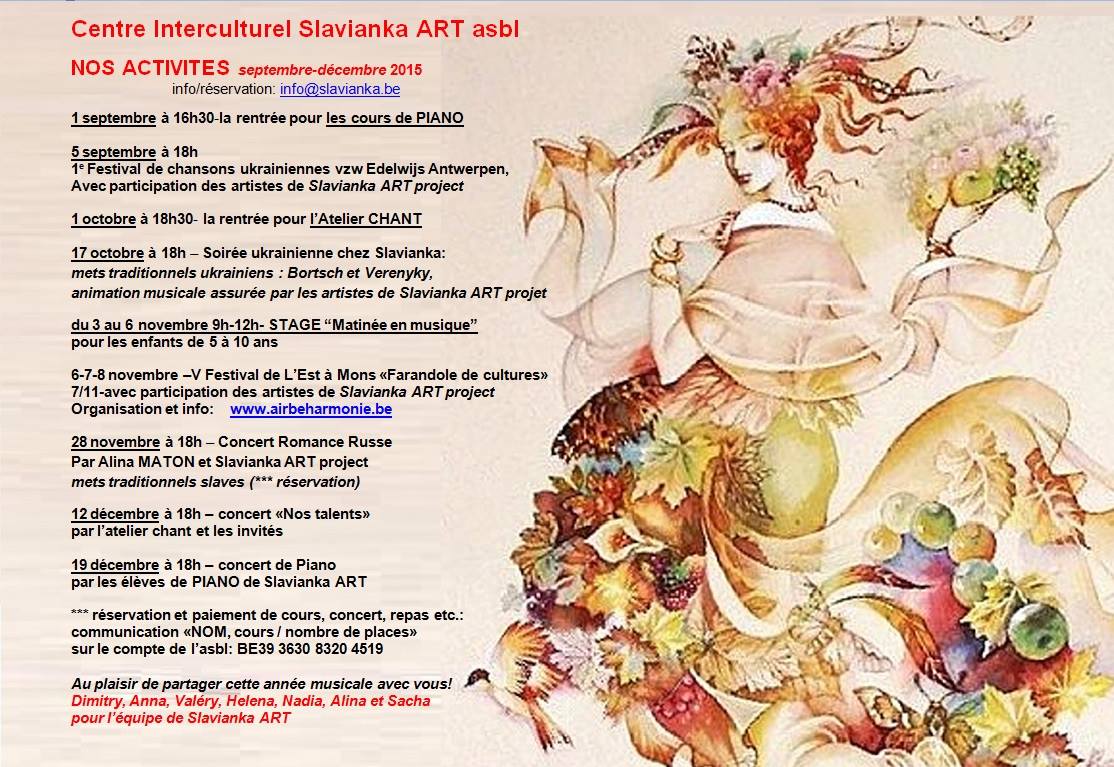 Het nieuwe seizoen wordt geopend op 5 september om 15u in een mooi kasteel in Mariakerke (Gent) met een gratis concert van Olga Mentchik, Sesiliya Kalisa, Maria Nikitskaya en hun leerlingen en presentatie van muziek en theater studio's. Schrijf je snel in want de plaatsen zijn beperkt!