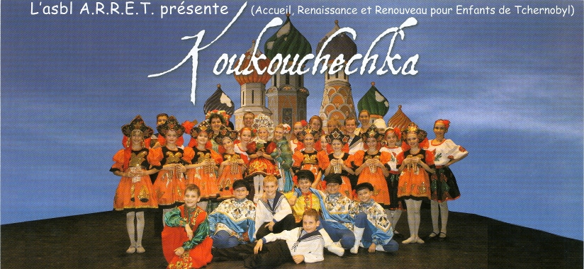 Koukouchetchka est une troupe Biélorusse, qui nous vient d’une école de Bobrouïsk (importante ville située en bordure de la zone sinistrée). La troupe est composée de jeunes danseurs et danseuses âgés de 9 à 14 ans. En une heure trente, ils vous présenteront une vingtaine de danses différentes. Le répertoire du groupe est varié. Il a pour base le folklore biélorusse et les danses populaires classiques des peuples de l’Est. Une chanteuse et une /un violoniste… seront également au programme cette année.