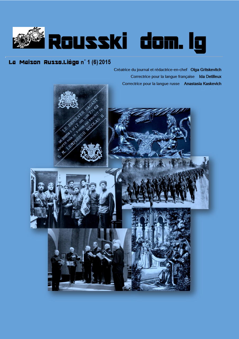 Olga Gritskevitch, Ida Detilleux, Anastasia Kaskevich La Maison Russe. Liège n°1 (6) 2015 Quelques titres extraits en guise de contenu : Заложники геополитики: золото Скифов | Les otages de la géopolitique. L’or des Scythes. Anastasia Kaskevich => Новая рубрика « Бельгийцы в России » РУССКОЕ ОРУЖИЕ. Материал подобрала и изложила Грицкевич Ольга. Les Auto‐Canons‐Mitrailleurs et la Drougina, histoire belgo‐russe par Nicolas Bieliavsky et Willy Wilmotte Mémoire russe des ACM en France Орден Святителя Николая Чудотворца Traduction du texte russe du diplôme de François Cornelis Mémoire belge de la Russie Origine des relations entre la Russie et la Belgique au cours de la 2e moitié du XIXe siècle Les émigrés russes blancs en Belgique lors de la 2e Guerre Mondiale НАЧАЛО ПЕРВОЙ МИРОВОЙ Ольга Грицкевич CHANTS DE L’ARMÉE BLANCHE Rossa i Nota La Marche aux Signaux (Siggnal`ny March) Новая рубрика « наша родословная » Род Кривенко – Савины КРИВЕНКО (материал взят из предоставления к дворянству) САВИНЫ (средневековый период взят из Литовской Метрики и Поколенной Росписи 1689 г. поданной в Разрядный приказ) Nos meilleurs vœux pour l'année 2015