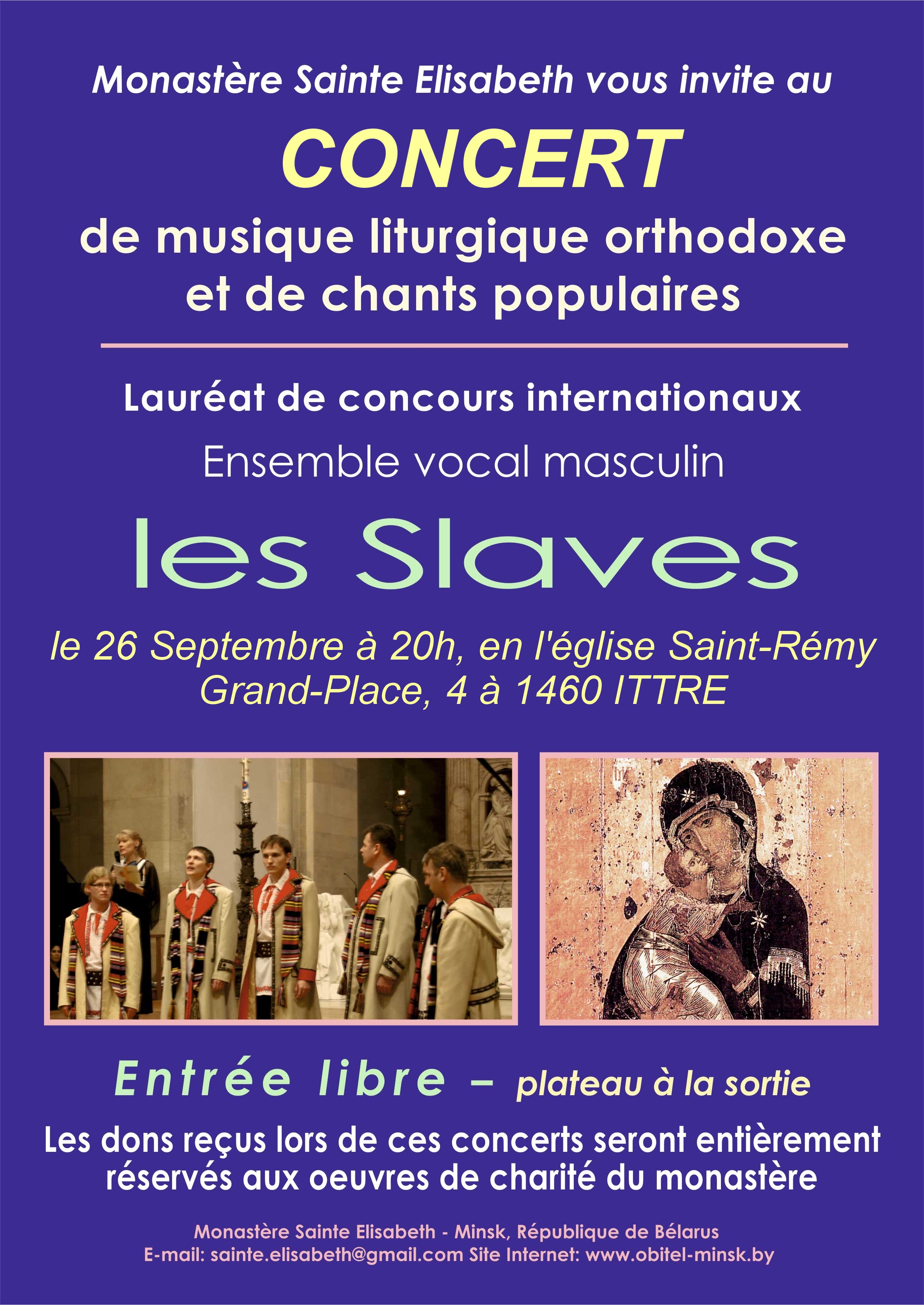 Концерт хора «Славяне» в церкви Святого Реми в Иттре (Ittre, Бельгия) Мужской профессиональный хор « Славяне » состоит из семи певцов, которые поют в хоре литургии Свято-Елизаветинского монастыря в городе Минске. Цель их благотворительных концертов — это сбор пожертвований в поддержку социальной деятельности Свято-Елизаветинского монастыря. Сердечно приглашаем вас, ваших близких и друзей посетить эти концерты, в программе которых будут представлены литургические песнопения, а также славянские народные песни. Будем очень признательны вам за помощь в распространении этой информации также среди ваших друзей. После концертов вы сможете приобрести различные диски хора, иконы, сувениры, мёд, травы, свечи и другие изделия мастерских обители.