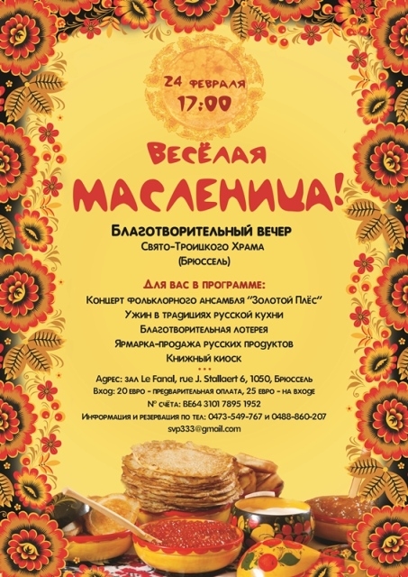 Concert de l'ensemble de musique folk | Концерт фольклорного ансамбля « Золотой Плёс » Souper traditionnel Russe | Ужин в традициях русской кухни Loterie | Благотворительная лотерея Vente de produits équitables du terroir Russe | Ярмарка-продажа русских продуктовVente de livres | Книжный киоск Cette soirée caritative est organisée au profit de l’Ecole et de la Communauté de l’Eglise Orthodoxe de la Sainte Trinité à Bruxelles. Pour plus d’informations vous pouvez nous contacter soit : par téléphone au 0473 549 767 ou au 0488 860 207 ; ou par courriel : svp333 at gmail dot com Nous vous accueillerons avec grand plaisir… С наилучшими пожеланиями du comité organisateur : Светлана (Svetlana POPOVA)