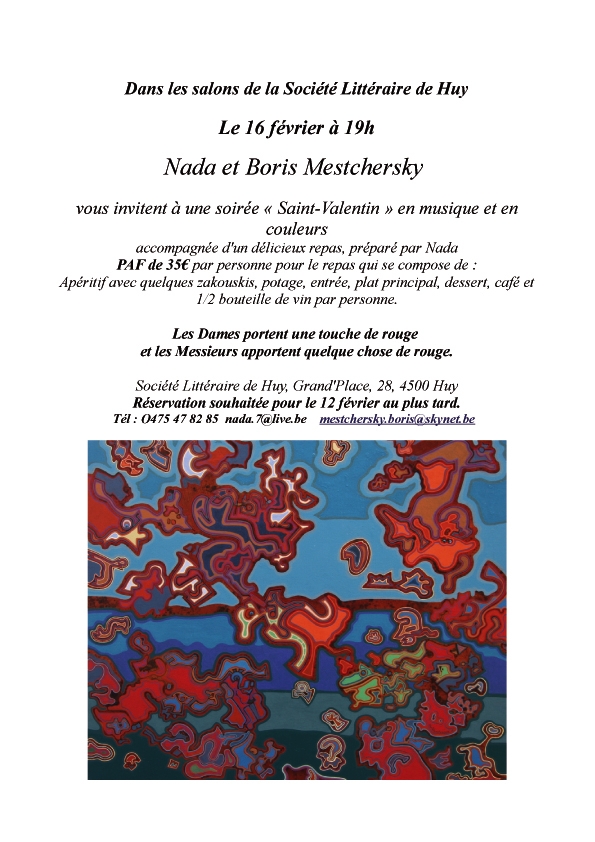 Rustam Sardalov, peintre russe surréaliste expose ses nouvelles toiles (aquarelles, le thème du « ballet ») au petit resto agréable en plein cœur de Bruxelles (quartier Louise). Vernissage le 23 février 2013 de 10 à 15 heures en présence de l'artiste. Il vous est possible de profiter du petit déjeuner à partir de 8 heures et du buffet dès 11 heures 30' (payant) et laissez-vous transporter au monde coloré de l'aquarelle.