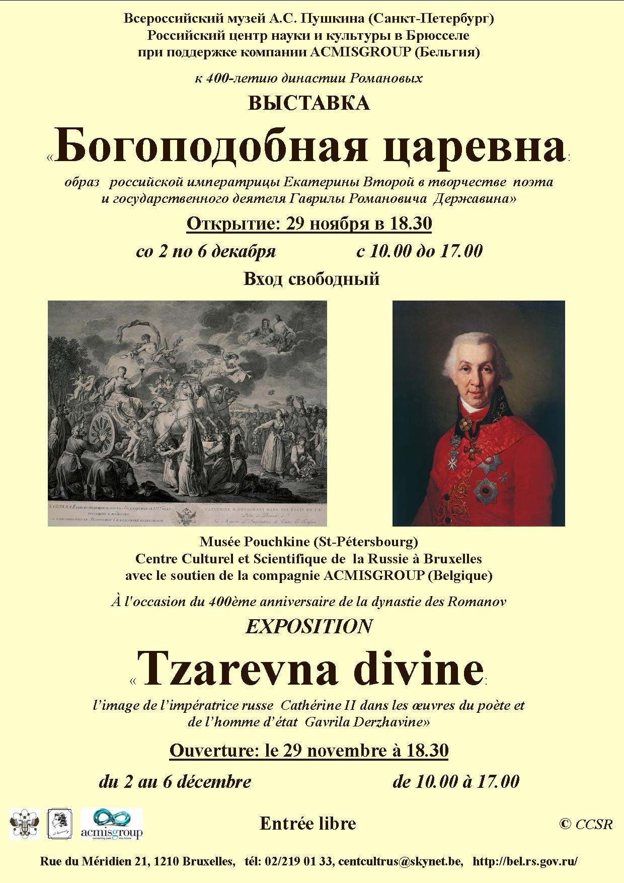 Musée Pouchkine (Saint-Pétersbourg), Centre Culturel et Scientifique de la Russsie à Bruxelles avec le soutien de la compagnie ACMISGROUP (Belgiqque). A l'occasion du 400ème anniversaire de la dynastie des Romanov. L'image de l'impératice russe Catherine II dans les œuvres du poète et homme d'état Gabriel Derjavine.