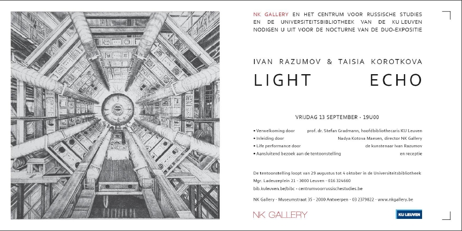 Duo-tentoonstelling hedendaagse Russische kunst in universiteitsbibliotheek. Het CRS (Centrum van Russische Studies) in samenwerking met NK Gallery en de universiteitsbibliotheek presenteert een expositie met hedendaagse Russische kunstenaars in de universiteitsbibliotheek. Twee internationaal erkende Russische kunstenaars, Ivan Razumov en Taisia Korotkova, gaan een dialoog aan op een bijzonder passend thema voor een universiteit - de grote Hadron collider, en alle mythes die daar rond bestaan.