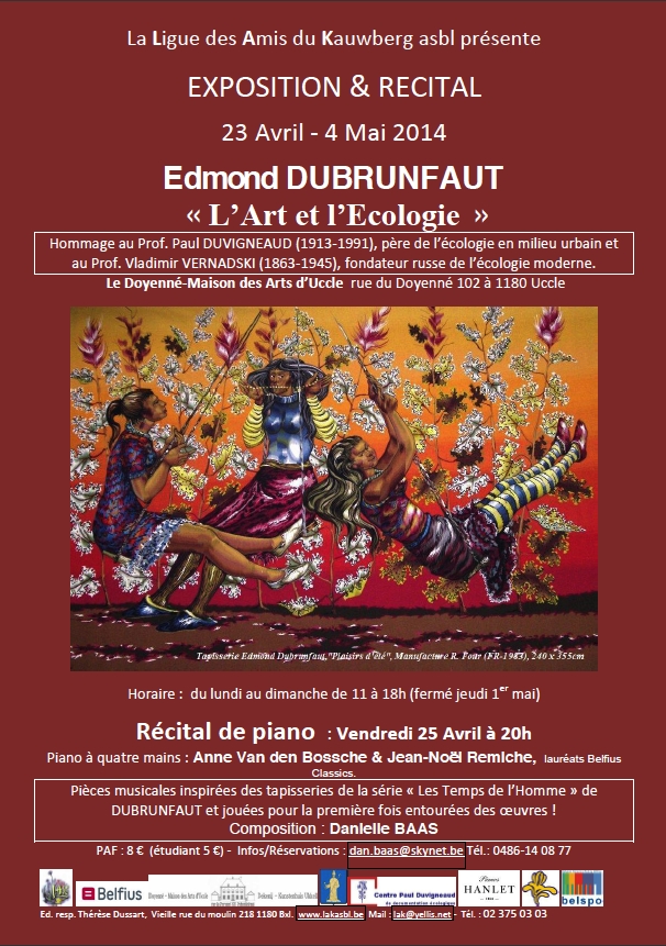 Edmond Dubrunfaut Ligue des Amis du Kauwenberg, asbl L'événement tourne autour d'Edmond Dubrunfaut, qui a réalisé et offert une de ses tapisseries à la Bibliothèque des Langues Etrangères de Moscou : Hommage sera rendu au Professeur mondialement connu Vladimir Vernadski, « le père de l'écologie », que le grand écologiste belge Duvigneaud a fait lire par Dubrunfaut (Duvigneaud et Dubrunfaut se rencontraient souvent : ils s'appréciaient et se soutenaient l’un l’autre) : Suite à cette influence de Vernadski, Dubrunfaut a créé pour la station bruxelloise du métro Louise (sortie palais de Justice) une monumentale tapisserie intitulée : « La terre en fleur, notre espoir ». Cet événement l'« L'Art et l'Ecologie » a été introduit par une courte conférence du Dr Nicolas Bieliavsky, président de la FPPR, présentant Paul Duvigneaud, Edmond Dubrunfaut et l'Ecologie : Les étapes de deux siècles de pensée scientifique consacrée à l'origine du Vivant. N.B. L'ambassadeur de Russie, et de nombreuses personnalités russes seront invitées au vernissage Récital de piano : le vendredi 25 avril à 20 heures. Piano à quatre mains : Anne Van den Bossche & Jean-Noël Remichee, Lauréats Belfius Classics. Pièces musicales inspirées des tapisseries de la série « Les temps de l'homme » de Dubrunfaut et jouées pour la première fois entourées des œuvres! Composition : Daniel Baas.
