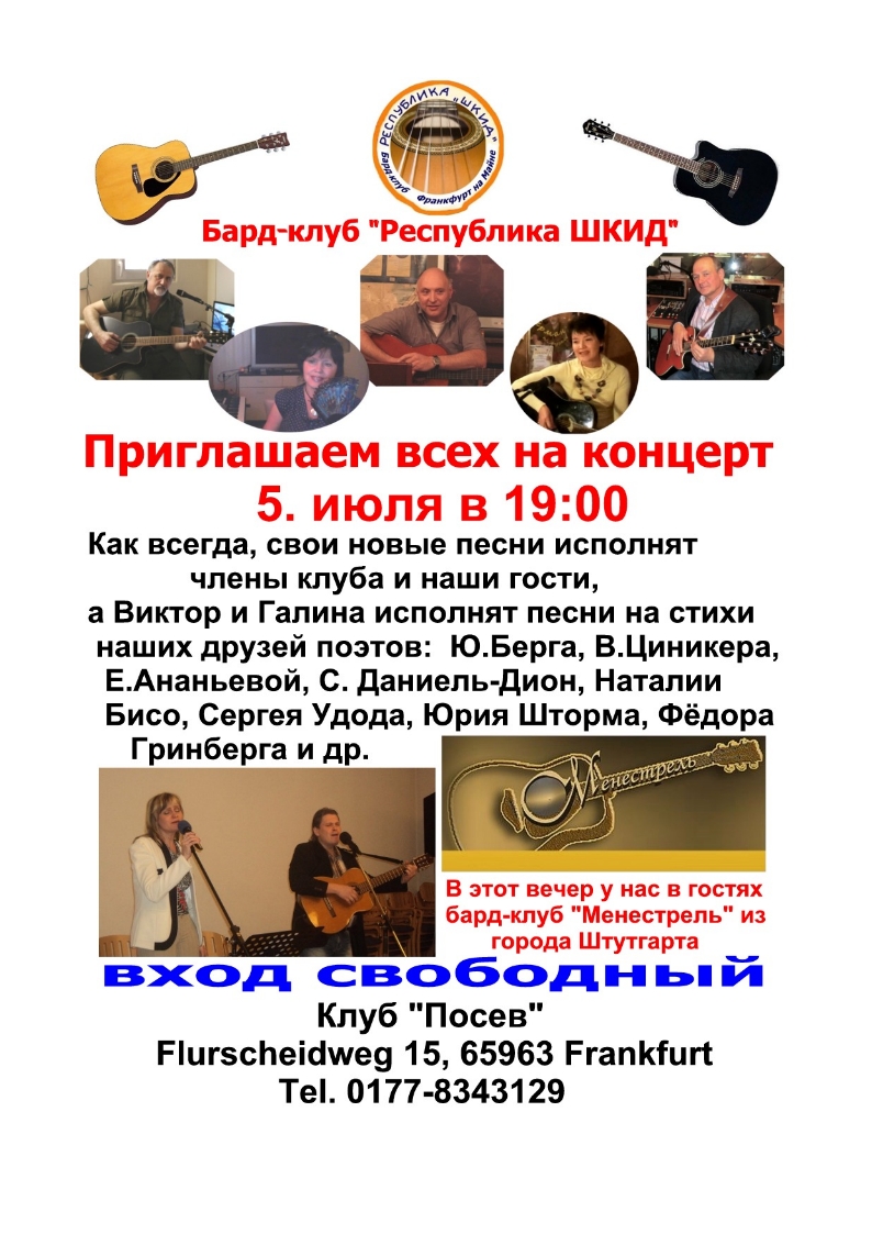 Дорогие друзья! Предвкушаем замечательный вечер! Как всегда, свои новые песни исполнят члены клуба и наши гости, Виктор и Галина исполнят песни на стихи наших друзей поэтов : Ю. Берга, В. Циникера, Е. Ананьевой, С. Даниель-Дион, Наталии Бисо, Сергея Удода, Юрия Шторма, Фёдора Гринберга и др. В этот вебер у нас в гостях бард-клуб « Менестрель » из города Штутгарда.