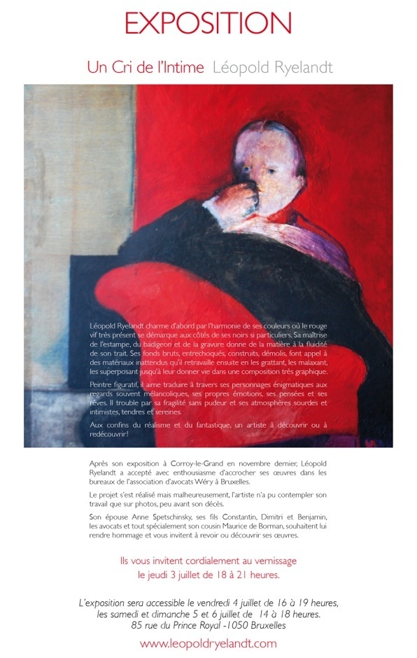 Après son exposition à Corroy-le-Grand en novembre dernier, Léopold Ryelandt a accepté avec enthousiasme d'accrocher ses œuvres dans le bureaux de l'association d'avocats Wéry à Bruxelles. Le projet s'est réalisé mais malheureusement, l'artiste n'a pu contempler son travail que sur photos, peu avant son décès. Son épouse Anne Spetschinsky, ses fils Constantin, Dimitry et Benjamin, les avocats et tout spécialement son cousin Maurice de Borman, souhaitent lui rendre hommage et vous invitent à revoir ou découvrir ses œuvres.