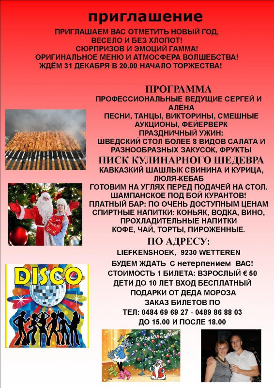 Заказать места можно с 15 декабря по телефону 0483 40 18 89 (Елена). Цена : 65 евро на человека. Рассчётный счёт : BE 210-634498149-03. Заказать места можно по телефону 0487 33 40 68 или по телефону 0496 70 42 57 (Анна).