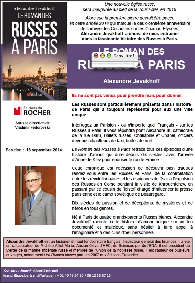 Alexandre Jevakhoff Editions du Rocher sous la direction de Vladimir Fédorovski Une nouvelle église russe, sera inaugurée au pied de la Tour Eiffel, en 2016. Alors que la première pierre devrait être posée en cette année 2014 qui marque le deux-centième anniversaire de l'arrivée des Cosaques sur les Champs-Elysées, Alexandre Jevakhoff a choisi de nous entraîner dans la fascinante histoire des Russes à Paris. Ils ne sont pas venus pour prendre mais pour donner.