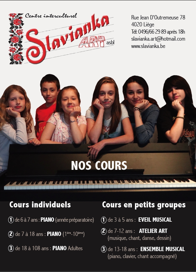 Renseignements par téléphone : 0496 66 29 89 après 18 heures ou courriel : slavianka.art at hotmail dot com Les paiements se font par période de 12 cours avec la communication : période, prénom de l'élève sur le compte de l'association : BE39 3630 8320 4519
