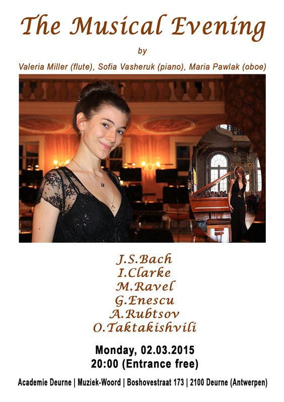 Valeria Miller (flute), Sofia Vasheruk (piano), Maria Pawlak (oboe) Приглашаем на Вечер классической музыки в Музыкальной академии Deurne.