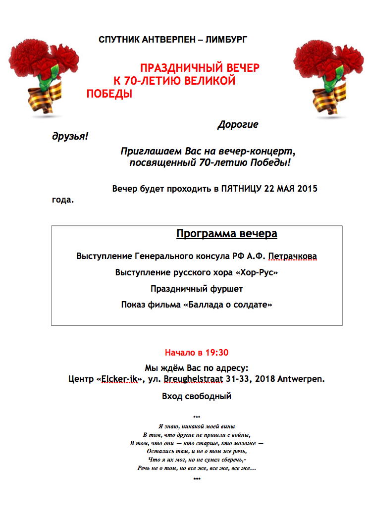 Ce petit agenda de mi-mai pour vous rappeler que ce dimanche 17, le festival « Rendez-vous avec la Russie » se tiendra bien au Parc Elisabeth avec en vedettes Tatiana Trenogina et le groupe de musique russe et tzigane « Karandash ». En ce qui concerne les commémorations qui actuellement se succèdent, à ne pas oublier le « Pélerinage annuel à Mourmelon » organisé le 24 mai au cimetière militaire russe de Saint Hilaire le Grand. C'est dommage qu'il faille ici choisir, car à la même date Nathalie Reingardt présente son nouveau spectacle « Театральный вечер » au Centre Culturel de la Fédération de Russie à Bruxelles. Y seront joués en langue russe des extraits de pièces de Gogol, Pouchkine, Tolstoï et Zagoskine. Signalons enfin que la « Ronde Musicale » nous accueille à sa soirée de bienfaisance le 22 mai à l'Hôtel Aloft « to enjoy the music and help Julia Tokmakova! ». Puis à ne pas perdre de vue le prochain « Circuit culturel dans les Pays Baltes » accompagné par Sacha et Macha Pouchkine fin juillet début août prochain et cet été l'exposition « Les Romanov de Saint-Pétersbourg à Saint-Briac » en Bretagne. Et pour n'oublier personne, nous vous invitons bien évidement à parcourir soigneusement la « LISTE » complète des nombreux événements - excursions, expositions, ventes d'art russe, conférences, séminaires, concerts, assemblées, nouveaux livres - car beaucoup se sont rajoutés au calendrier depuis sa récente diffusion.