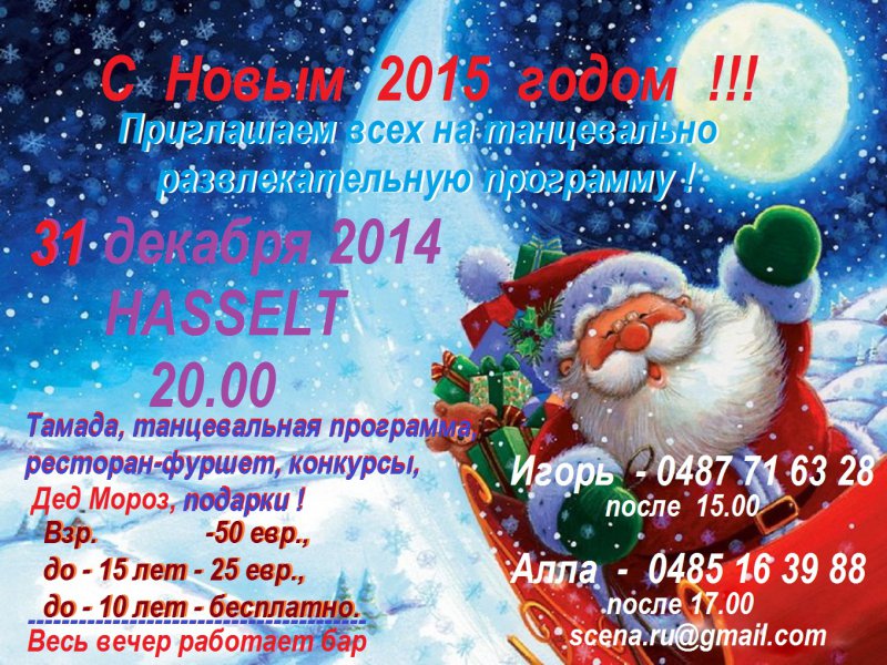 Relevons cependant qu'à la veille de Noël le « Triomphe de l'Art » nous projette son jazz en feu d'artifice Джазовый фейерверк. Puis Alexandre von Sivers nous revient au théâtre dans un spectacle spécial Saint-Sylvestre, alors qu'une soirée Новогодний вечер 2015 nous attend par ailleurs à Wetteren.