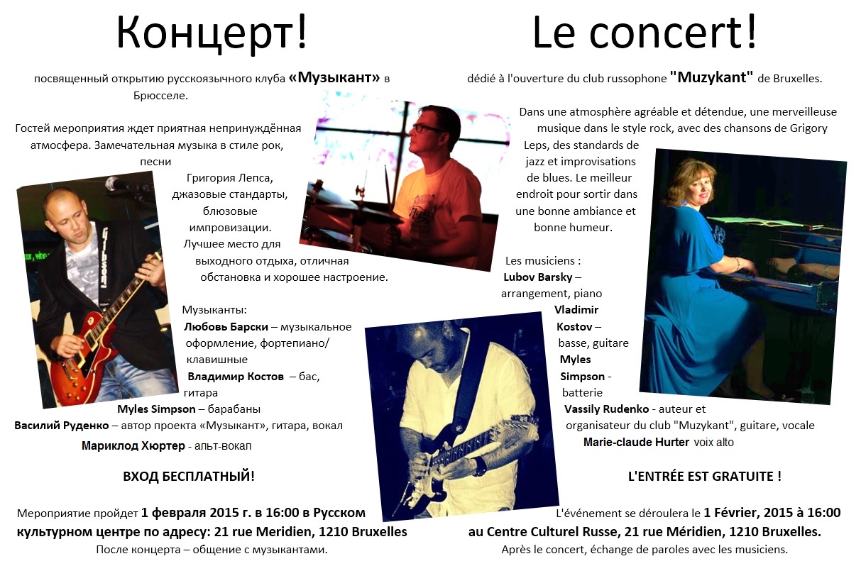 Посвящённый открытию русскоязычного клуба « Музыкант » в Брюсселе. Dédié à l'ouverture du club russophone « Muzikant » de Bruxelles. Dear friends, I send you all my best wishes for a Happy New Year 2015 and want to use this occasion to attach this invitation for our next concert. I am very glad to open this New Year with opening concert of a New russian club « Muzikant ». In the program russian rock pop songs, jazz improvisations, classical themes in jazz arrangements, chanson française. This event takes place on February 1, 16 o'clock at the Russian Cultural Center, rue du Meridien 21, Brussels. Hope to see you all,  Luba Barsky.