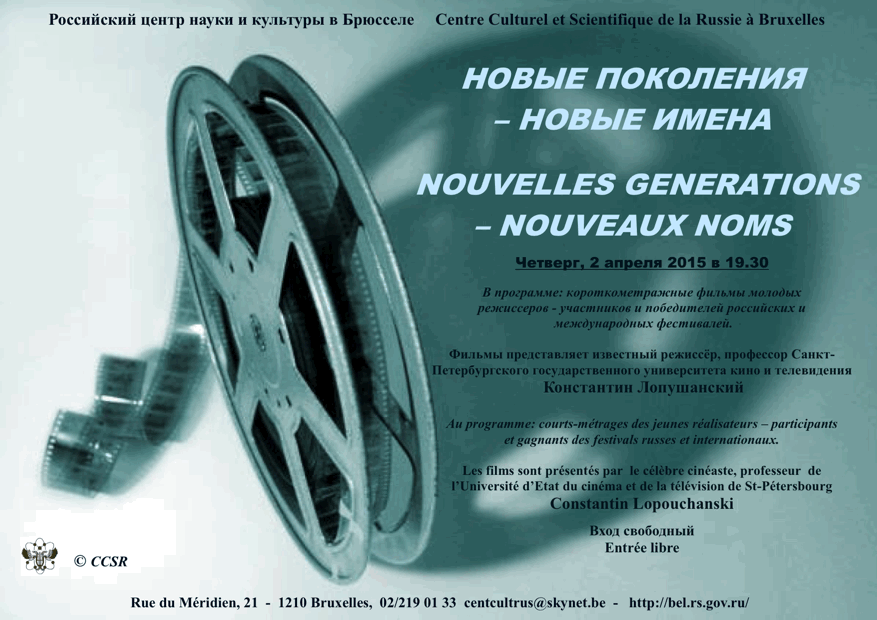 Начиная с 2008г. ежегодно в Брюсселе и других городах БельгииРоссийский центр наки и культуры в Брюсселе совместно с Санкт-Петербургским государственным университетом кино и телевиденияпроводит фестиваль современного российского молодежного кино «Новыепоколения - новые имена». Художественным руководителем фестиваля является режиссер,народный артист России, профессор Санкт-Петербургского университетакино и телевидения К.С.Лопушанский. Цель проекта - ознакомление бельгийской аудитории (преподавателей иучащихся кинематографических вузов, студентов, изучающих русский язык,любителей кино) и проживающих в Бельгии соотечественников ссовременным российским кинематографом, проблемами и темами, которыеволнуют сегодня молодое поколение России. Программа включает в себя демонстрацию и обсуждение игровыхкороткометражных фильмов молодых санкт-петербургских режиссёров.С презентацией фильмов и рассказом о различных направлениях ижанрах современного российского кино выступит К.С.Лопушанский. Просмотр состоится в Российском центре науки и культуры в Брюсселе2 апреля 2015 года в 19:30.