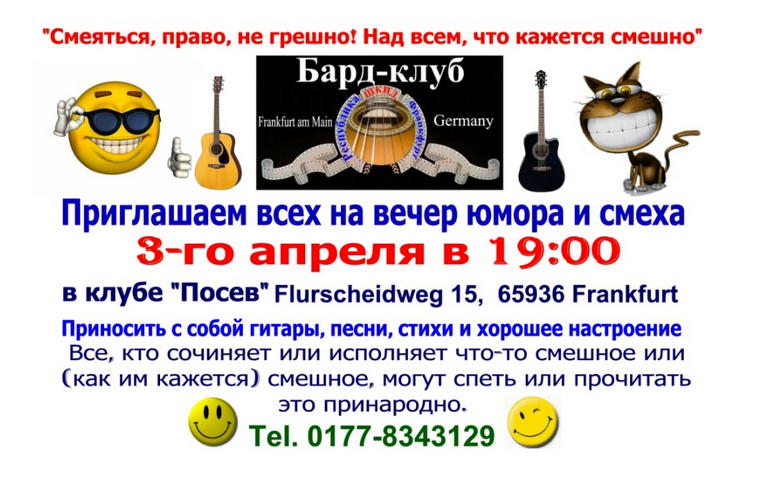 « Смеяться, право, не грешно! Над всем, что кажется смешно » Приглашаем всех на вечер юмора и смеха. Приносить с собой гитары, песни, стихи и хорошее настроение. Все, кто сочиняет или исполняет что-то смегное или (как им кажется) смешное, могут спеть или прочитать это принародно.