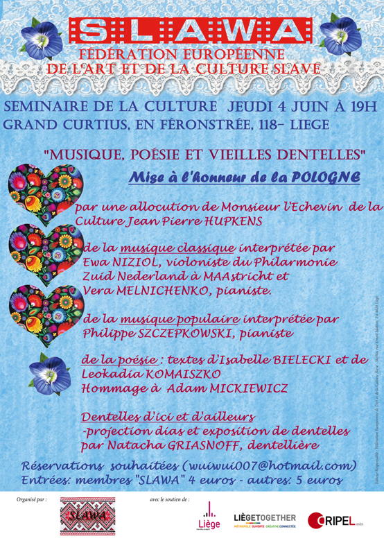 Chers parents, Chers amis, Chers collaborateurs, Chers amis de la Presse, C'est avec le plus grand plaisir que je vous adresse cette affiche en pièce jointe. Il s'agit en effet d'annoncer une soirée qui porte certes un titre particulier « Musique, poésie et vieilles dentelles » mais qui, surtout met à l'honneur un pays et surtout un peuple que nous connaissons bien : La POLOGNE. A l'heure où beaucoup s'interrogent sur l'émigration comme phénomène social mondial, et qui concerne aussi notre région, les polonais (tout comme les italiens d'ailleurs), issus d'une première vague de migrants venus pour travailler et établir leurs familles; ces personnes disais-je ont réussi pleinement à s'intégrer parmi nous et nous enrichir de leur culture. Il y a eu aussi bien entendu autre émigration - politique, principalement pour fuir des régimes où ils risquaient leur peau ; ce fut le cas de ceux qui ont fui le régime communiste au sortir des guerres (révolution d'octobre pour les russes blancs, 40-45 pour les peuples de Pologne et autres pays de l'Est). Et bien, les enfants et les petits-enfants de ces migrants, ceux aussi qui sont issus d'unions mixtes avec des belges, souhaitent aujourd'hui partager avec vous cette culture en vous promettant une soirée légère et divertissante. Musique et poésie polonaise et exposition de dentelles par la fille de migrants russes blancs. Nous espérons que vous serez nombreux à soutenir cette initiative de la Fédération européenne de l'art et de la culture slave « SLAWA » et que vous viendrez applaudir ces artistes le jeudi 4 juin; vous joignant ainsi au soutien précieux de l'Echevinat de la Culture de la Ville de LIEGE. N'hésitez pas à partager ce texte et cette affiche autour de vous. Au nom de tous, je vous remercie de l'intérêt que vous porterez à ce message et sur votre présence le 4 juin. Les réservations ont pour but de retenir autant de sièges que de participants, elles se font à mon adresse mail. Anne WUIDAR, Vice-présidente de la Fédération Européenne de l'Art et de la Culture Slave « SLAWA »