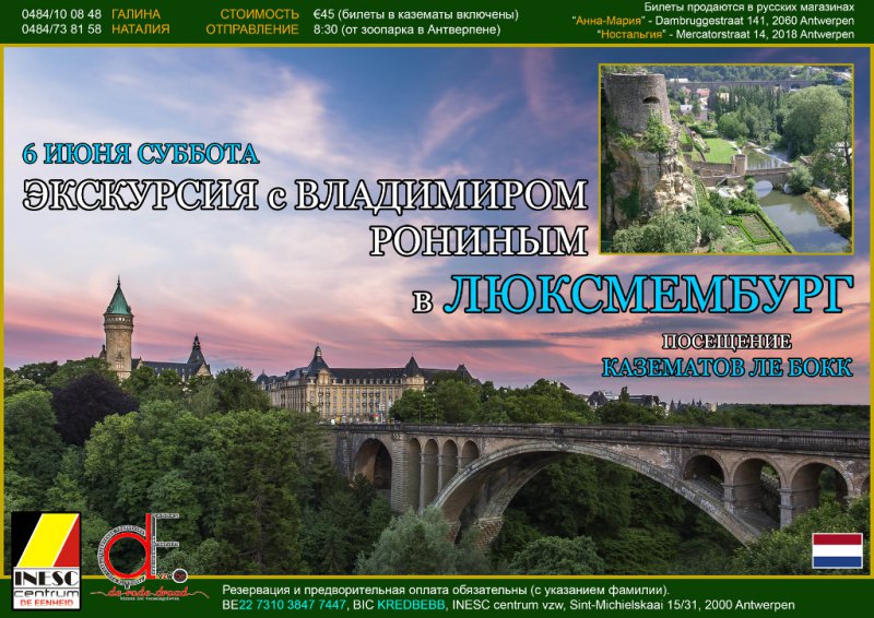 Les vacances approchent, et il est temps de penser aux camps d'été : il y a celui des Vitiaz à Laffley en France et celui de Saturne en Belgique. Puis pour les adultes, c'est le Circuit culturel aux Pays Baltes accompagné par Sacha et Macha Pouchkine qui peut encore séduire bien des participants. Dans le cadre du 175ème anniversaire de la naissance de Piotr Tchaïkovsky, Nathalie Bourmeister, pianiste et Victoria Lepko poétesse offrent un Concert-Récital exceptionnel à l'Ecole des Arts de Braine l'Alleud. Signalons aussi que l'auteur de notre fond de page, Boris Mestchersky ouvre ces week-ends de juin, son atelier au public à Huy, que Yana Cozari vient de poster son reportage vidéo de la soirée de bienfaisance du fonds « Жизнь как чудо » et que la FPPR tient son assemblée générale le 16 juin au Club Albert.