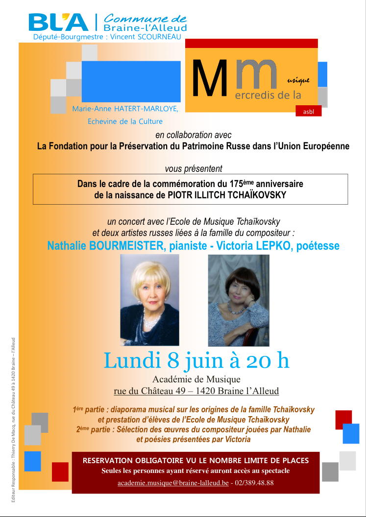 Dans le cadre du 175ème anniversaire de la naissance de Piotr Tchaïkovsky, Nathalie Bourmeister, pianiste et Victoria Lepko poétesse offrent un Concert-Récital exceptionnel à l'Ecole des Arts de Braine l'Alleud.