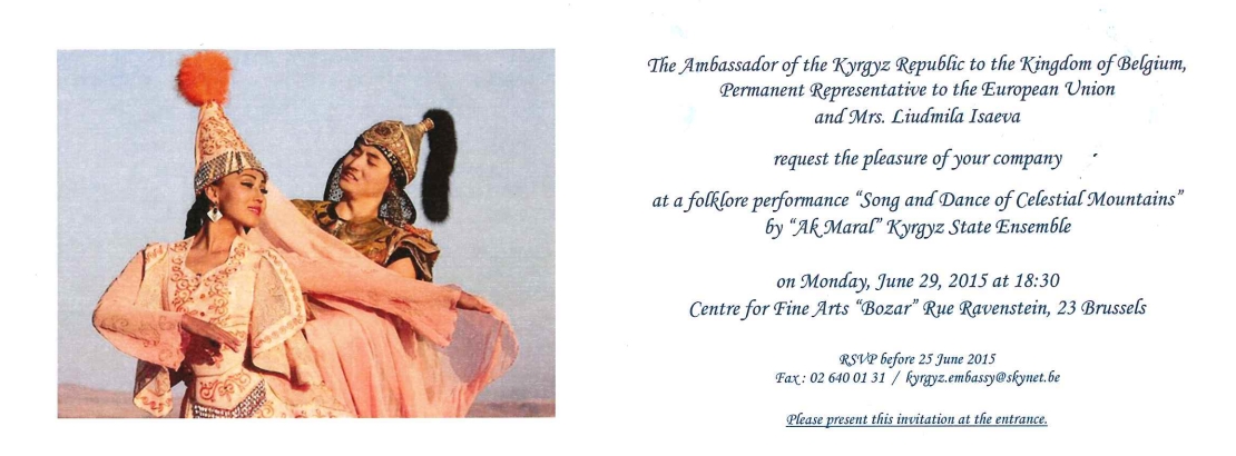 The Ambassador of the Kyrgyz Republic to the Kingdom of Belgium, Permanent representative to the European Union and Mrs. Liudmila Isaeva request the pleasure of your company at the folklore performance « Song and Dance of Celestial Mountains » by « Ak Maral » Kyrgyz State Ensemble.