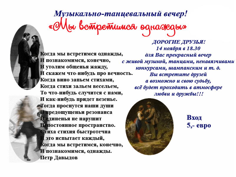 Вход: € 7 (+ напиток) Тел.: 051/30 90 62 или 0486/82 08 87 Татьяна, 051/43 64 97 или 0486/75 54 13 Елена (Петросяны).