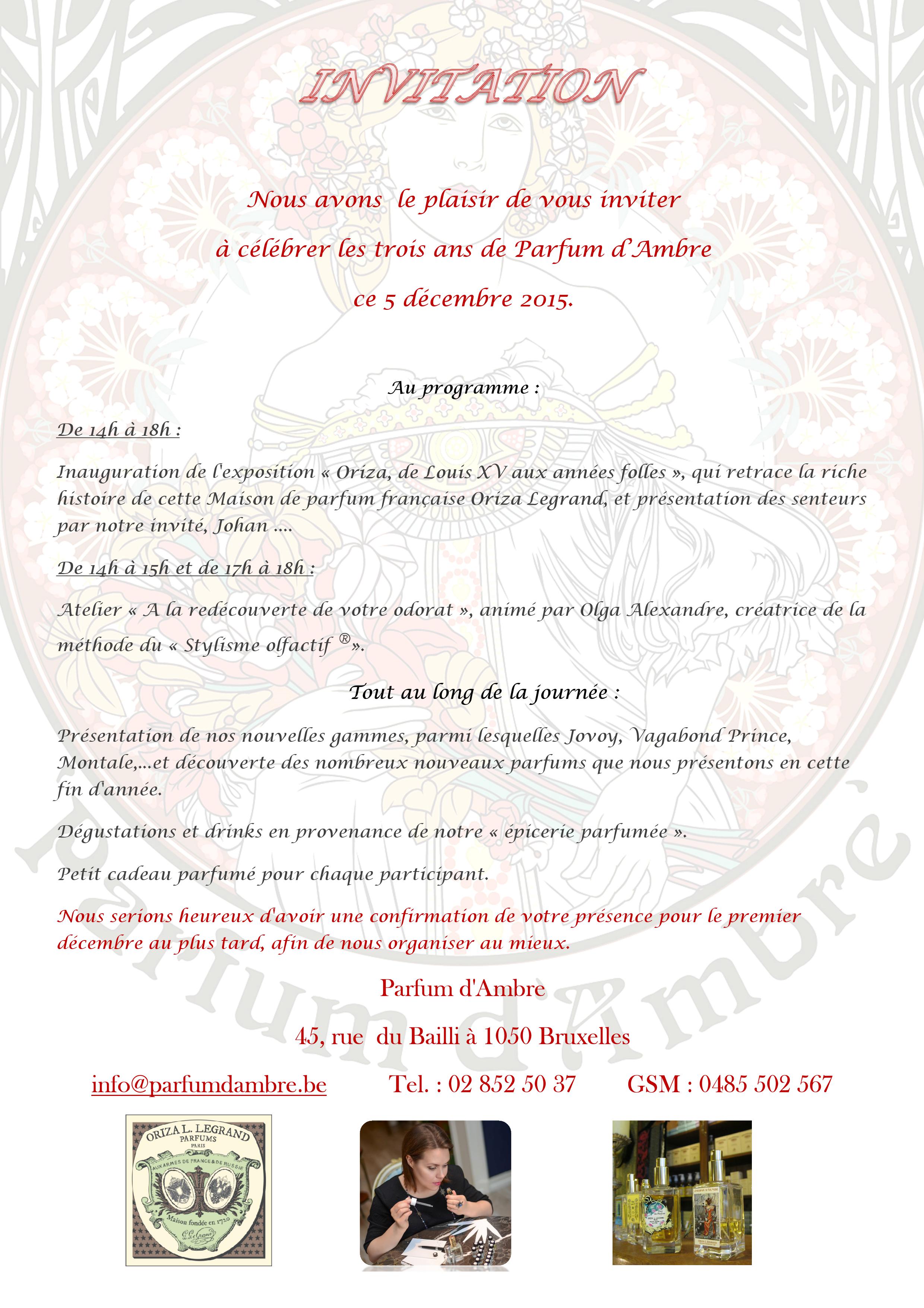 Invitation Nous avons le plaisir de vous inviter à célébrer les trois ans de Parfum d'Ambre ce 5 décembre 2015. Au programme : de 14 à 18 heures Inauguration de l'exposition « Oriza, de Louis XV aux années folles », qui retrace la riche histoire de cette Maison de parfum française Oriza Legrand, et présentation des senteurs par notre invité, Johan ... de 14 à 15 heures et de 17 à 18 heures Atelier « A la redécouverte de votre odorat », animé par Olga Alexandre, créatrice de la méthode du « Stylisme olfactif ». Tout au long de la journée : Présentation de nos nouvelles gammes, parmi lequelles Jovoy, Vagabond Prince, Montale,... et découverte des nombreux parfums que nous présentons en cette fin d'année. Dégustations et drinks en provenance de notre « épicerie parfumée ». Petit cadeau parfumé pour chaque participant. Nous serions heureux d'avoir une confirmation de votre présence pour le premier décembre au plus tard, afin de nous organiser au mieux.