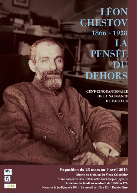 A l'occasion du cent cinquantième anniversaire de la naissance du philosophe Léon Chestov (Kiev 1866 - Paris 1938), une exposition organisée par la Société d'Etudes Léon Chestov ouvrira ses portes à la Mairie du 6ème arrondissement, 78 rue Bonaparte - 75006 Paris, Salon du Vieux-Colombier, le mercredi 23 mars 2016 à 10h30 jusqu'au samedi 9 avril 12h.