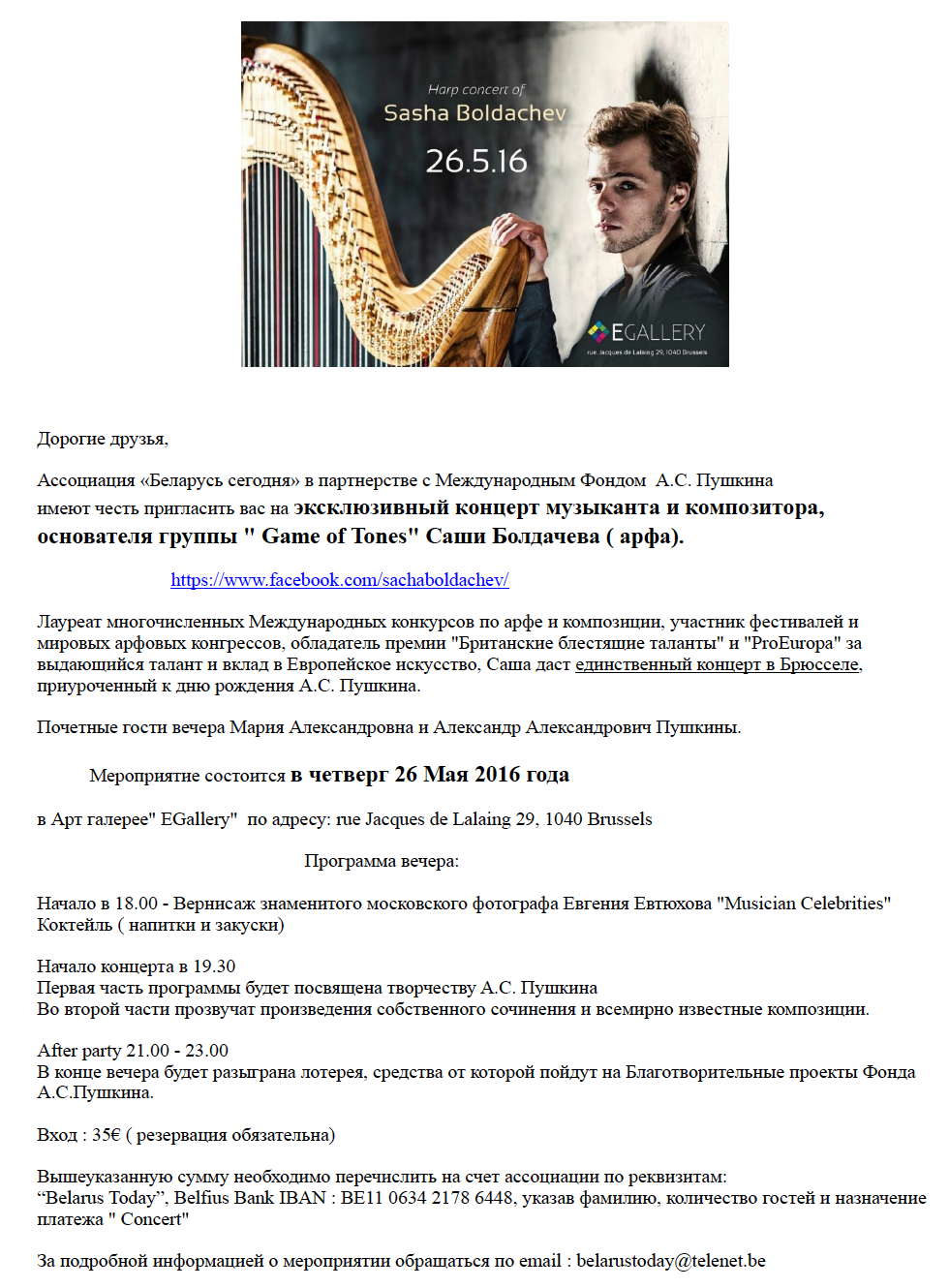 Вход : 35€ ( резервация обязательна) | Cost : 35€ (reservation is obligatory) Вышеуказанную сумму необходимо перечислить на счет ассоциации по реквизитам: « Belarus Today », Belfius Bank IBAN : BE11 0634 2178 6448, указав фамилию, количество гостей и назначение платежа « Concert » За подробной информацией о мероприятии обращаться по э-почте : belarustoday at telenet dot be