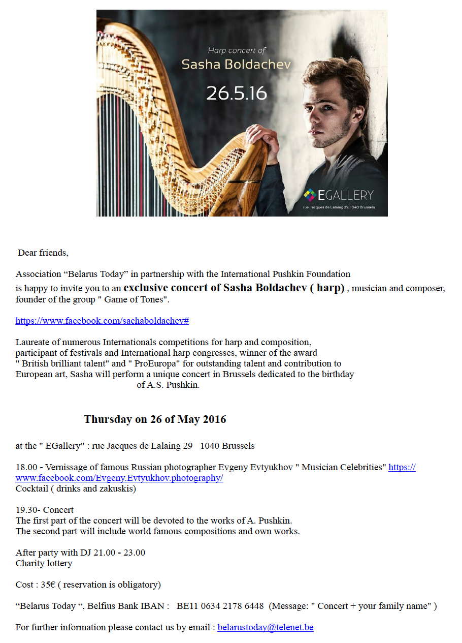 Вход : 35€ ( резервация обязательна) | Cost : 35€ (reservation is obligatory) Вышеуказанную сумму необходимо перечислить на счет ассоциации по реквизитам: « Belarus Today », Belfius Bank IBAN : BE11 0634 2178 6448, указав фамилию, количество гостей и назначение платежа « Concert » За подробной информацией о мероприятии обращаться по э-почте : belarustoday at telenet dot be
