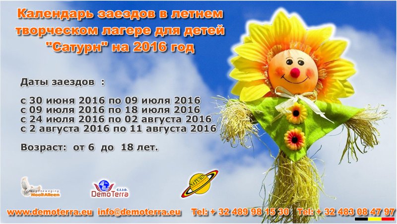 Сатурн — это место погружения в сказочный мир, это прекрасное сочетание активных приключений, туристических и творческих мастер-классов. Это 10 дней, на протяжении которых ребята становятся настоящими актерами, певцами, спортсменами а, самое главное- настоящей командой, которой все по плечу и где каждый член команды важен и нужен! А еще добавьте к этой программе обучение в Академии мастеров волшебного слова (ежедневные занятия по русскому, английскому и французскому языках). Место проведения : Туристический комплекс SolCrees, Спа, Бельгия Даты заездов : с 30 июня 2016 по 09 июля 2016 с 09 июля 2016 по 18 июля 2016 с 24 июля 2016 по 02 августа 2016 с 02 августа 2016 по 11 августа 2016 Возраст : от 6 до 18 лет