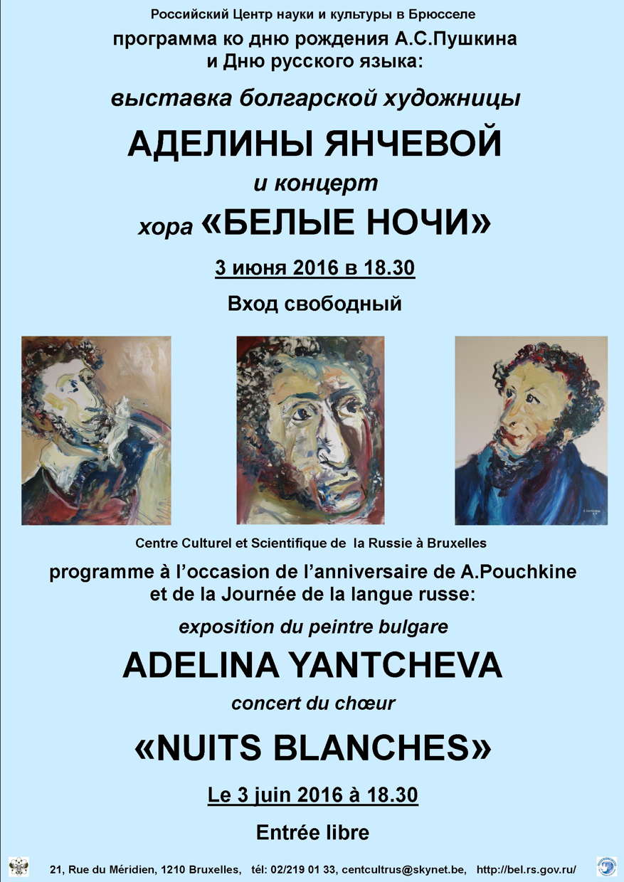 Avis aux membres et sympathisants de la Fondation Internationale Pouchkine de ne pas oublier la commémoration du 207ème anniversaire de la naissance du grand poète ces 3 juin 2016 à 18 heures au Centre culturel de la Fédération de Russie et 4 juin 2016 à 15 heures au pied de sa statue à Laeken et à ceux de la FPPR de ne pas oublier l'assemblée générale du 9 juin 2016 dès 11 heures au Club Prince Albert à Bruxelles.