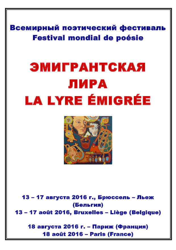 Festival mondial de poésie Дорогие любители русской поэзии! Ассоциация « Эмигрантская лира » приглашает вас на большой музыкально-поэтический вечер « Лира », который пройдёт 13 августа 2016 года с 18.30 по 21.30 в большом зале Российского центра науки и культуры в Брюсселе (rue du Méridien, 21, 1210 Bruxelles. Проезд: метро Ботанический сад (Botanique), трамваи 92, 93, 94, автобусы 65, 66).