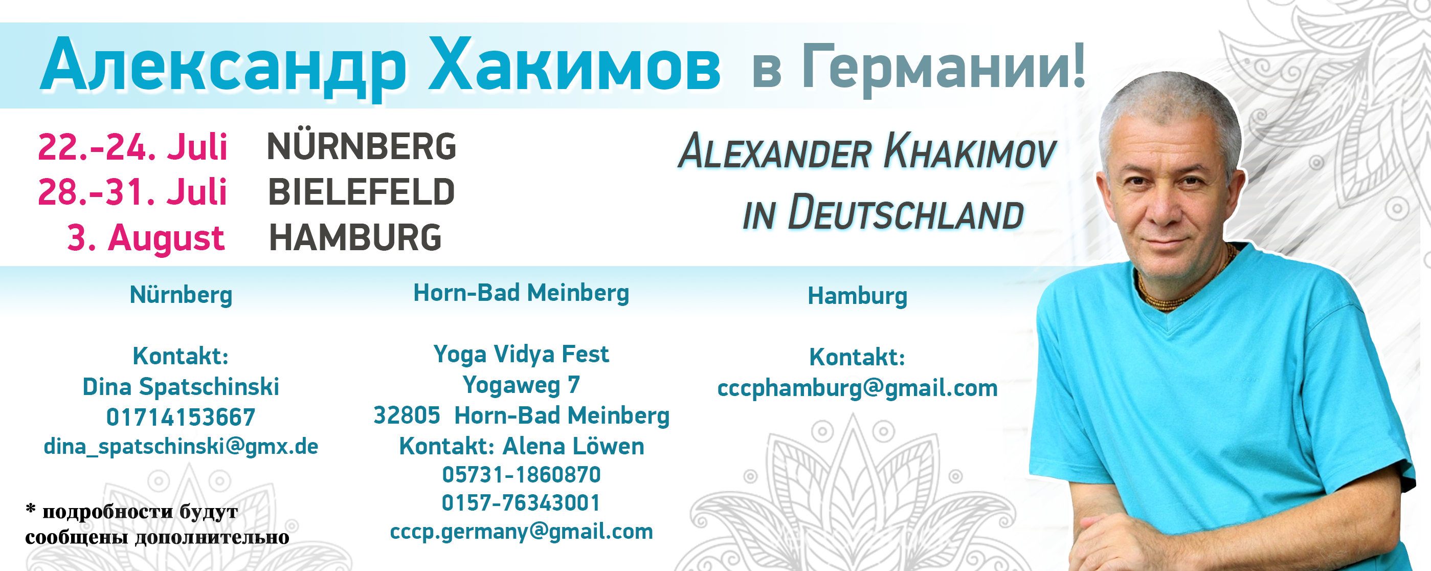 Добрый день, дорогие друзья! Спешим сообщить Вам, что этим летом нас порадует своим визитом без сомнений особенная личность, Александр Хакимов. В приложении находится анонс его поездок, более подробную информацию мы сообщим Вам позже. Детали Вы также можете узнать по указанным в анонсе телефонам. Всех благ Вам и до встречи! Команда организаторов тура