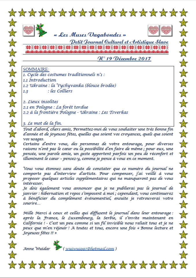 Sur réservation et prépaiement avant le 10 décembre 2017 (PAF : 5 €) Info/réservation : slavianka.art at outlook.com / compte bancaire : BE35 7440 6767 1637 En tournée :