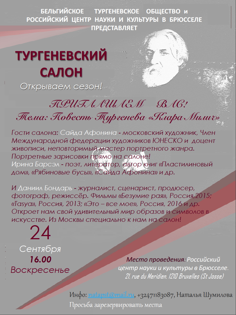 Événements : 1 => На выходные дни - в Арденны (Ardennes belges) 4-7 => Exhibition « Contemporary Art in Belarus » & Concert « Chamber Orchestra of the Belarusian College of Music » (Bruxelles) 6,20,26 => Concert : une ballade finlandaise (Paris) 6 => Великий Бетховен. Le grand Beethoven (Saint-Josse) 6 => Традиционные среды. Старые мастера (Bruxelles) 9 => Soirée de clôture exposition Roman Minin (Bruxelles) 9 => Гитарный форум с учатием авторов и исполнителей (Sossenheim) 10 => From Russia to America in 90 Minutes - Musical journey cello & piano (Bruxelles) 16-17 => Автобусная экскурсия => Версаль, Париж (Paris, Versailles) 17 => Si Pouchkine vous était conté... (Les Awirs) 20 => Нелюбовь. Faute d'amour. Loveless (Allociné) 21-24 => Le Lac Des Cygnes / Het Zwanenmeer (Gent/Hasselt/Antwerpen) 22 => Salon polonais. Casimir Poniatowski (Chênée) 23 => Концерт Татьяны и Сергея Никитиных « Под музыку Вивальди » (Antwerpen) 24 => L’Âme russe et les peintres sonores (Ixelles) 25-30 => Неделя русской культуры. Week van de Russische Cultuur (Saint-Josse) 28 => Rétrospective musicale - Concert de musique classique russe. (Saint-Josse)