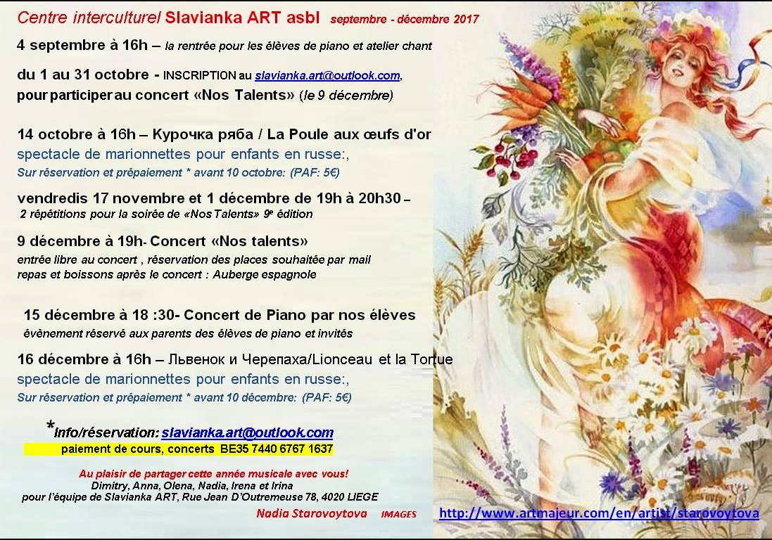 | Calendrier vava.be octobre 2017 | Liste des intitulés | Album des affiches/illustrations | Descriptifs détaillés Événements d'octobre 2017 :1 => Cinematek - Classics & anthologies Rusland 2017 (Bruxelles) 1 => Concert - Julie Jaroszewski (Bruxelles) 1 => Spectacle - Si Pouchkine vous était chanté (Fontainebleau) 1 => Visite - Национальный ботанический сад (Meise) 1 => Excursion - с Владимиром Рониным и не только по Остенд (Oostende) 2,16 => Conversation - Table russe (Mons) 4 => Visite - Художественный музей Искусство и общество. (Bruxelles) 5 => Conférence - La Russie, agresseuse, agressée ou partenaire ? (Woluwé-Saint-Lambert) 6 => Concert - Anna Vinnitskaya (Nivelles) 6-30 => Exposition - 1917 : la fin des tramways belges en Russie (Liège) 7- => Exposition - Dutch Masters from the Hermitage. Treasures of the Tsars (Amsterdam) 7 => Excursion - по Генту (Gent) 8 => Présentation - 100 jaar Oktoberrevolutie. Tien dagen die de wereld deden wankelen. Reds (Borgerhout) 8 => Débat - De la Révolution Russe aux goulags (Blois) 11 => Conférence - 2017 : le spectre de la révolution qui hante la Russie d’aujourd’hui (Bruxelles) 12 => Conférence - L'art musical dans le feu de la Révolution russe (Aix-en-Provence) 12 Conférence - Russie : grand retour d’une grande puissance ? (Woluwé-Saint-Lambert) 13 => Exposition - L'art d'ici et d'ailleurs (Huy) 13-14 => Musique - ballet russe et Concerto de Grieg (Roeselare/Gent) 14 => Concert - Krachtige verhalen (Gent) 14-15, 21-22 => Exposé - La Russie ancienne (Stockel) 14-15 => Théâtre - Majakovski/Oktober (Antwerpen) 14 => Marionnettes - Курочка ряба (Liège) 14 => Excursion в Ипр и Кортрейк (Kortrijk/Ieper) 18- => Exposition - Et 1017 devient Révolution... (Paris) 19-21 => Colloque - Les trajectoires d’Octobre 1917 (Paris) 21-22 => Commémoration - Centenaire de la Révolution Russe 1917 (Schaerbeek) 22 => Ballet Live 2017 : Le Corsaire (Kinepolis) 22-26 => Conférence : Лидерство в образовании (Etterbeek) 23 => Conférence FPPR - Mes derniers jours à Tsarskoïe Selo (1917). Souvenirs de mon grand-père (Woluwé-Saint-Lambert) 26 => Concert - Une ballade finlandaise (Paris) 26 => Extraits commentés - Semion Kotko de Prokoviev (Saint-Josse-ten-Noode) 27 => Forum CCBLR - Belarus Invest in tomorrow (Luxembourg) 31- => Exposition - Peintures Révolution Russe (Genève) Notes : Revue FPPR - Fondation Préservation Patrimoine Russe, n°6 (juin 2017), 82 pages ; Gala « Patrimoine Russe » le 17 novembre 2017 dès 19 heures au Château du Lac à Genval. Attention : inscription requise avant la fin du mois pour bénéficier du prix attractif ; Événements => déjà 29 et 15 activités respectivement postées en novembre et décembre 2017. |