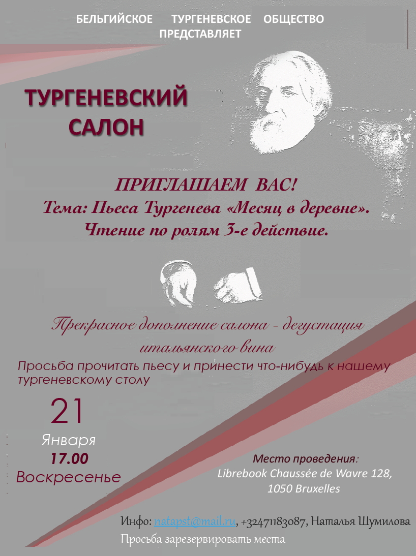 Evénements de janvier 2018 : 5-31 => Ménage à trois - Expo (Antwerpen) 6 => Traditionnel Nouvel An russe (Luxembourg) 7 => Carmina Burana (Gent, Forest, Antwerpen) 7,13,20,26 => Activités ARINA (Bruxelles/Antwerpen) 11/1-11/2 => Exploration du Monde - Russie (Différents lieux en Belgique) 13 => Рождество и Старый Новый Год! (Francfort) 17-21 => Festival films Géorgie, Ukraine, Arménie, Azerbaïdjan, Moldavie et Biélorussie (Bruxelles) 20/1-19/6 => Célébrations bicentenaire Ivan Tourguéniev (Bougival) 21 => Ballet Romeo and Juliet (Kinepolis) 21 => Concert Ivan Thirion / Julietta Kocharova (Jette) 24/1-21/5 => Soviet Design. Red Wealth (Laken) 27 => Belarus 4'33. Sun City of Dream Point Zero (Bruxelles) Suivis : Colloque 1917-2017 : Espoirs, utopies et héritages de la Révolution russe (Saint-Gilles) Inauguration statue à la mémoire des victimes de la révolution et du régime soviétique (Uccle)