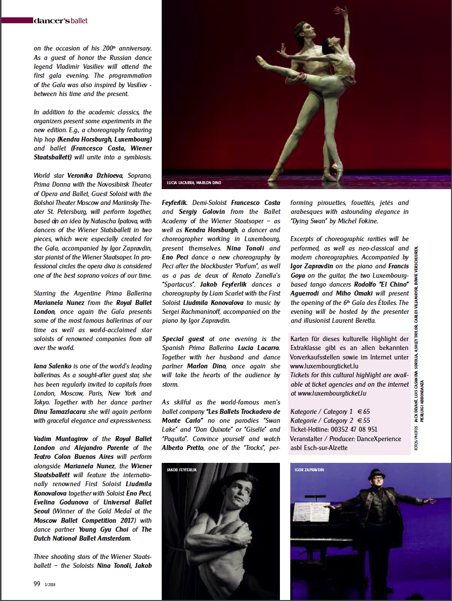 Ballettgala mit gefeierten Stargästen im Grand-Théâtre Die jährlich stattfindende Gala des Etoiles wurde bereits im Jahr 2012 ins Leben gerufen und hat inzwischen weltweit BallettfreundInnen gefunden. Nach den großartigen Erfolgen der letzten fünf Jahre, mit StartänzerInnen wie z.B. Svetlana Zakharova Lucia Lacarra oder Vladimir Malakhov haben die Veranstalter von DanceXperience an einem neuen Konzept für das internationale Balletthighlight gefeilt, das im Grand Théâtre Luxemburg am 26. und 27. Mai 2018 zur Aufführung kommen und der begeisterten Fangemeinde sicherlich erneut Standing Ovations entlocken wird. “A Breeze of Russian Seasons” soll einerseits an den großen Impresario Sergei Diaghilev erinnern, der durch seine schöpferische Kraft und Kühnheit die Welt des Balletts vor über 100 Jahren revolutionierte, sowie als Hommage dem genialen französisch-russischen Balletttänzer und Choreographen Marius Petipa anlässlich seines 200. Geburtstages gewidmet werden. Als Ehrengast beim ersten Gala-Abend wird die russische Tanzlegende Vladimir Vasiliev erwartet, der auch die Programmierung des Abends zwischen seiner damaligen Zeit und der Gegenwart inspiriert hat. Neben den akademischen Klassikern wagen die Veranstalter einige Experimente und verleihen ihrer Gala eine neue Ausrichtung. So wird z.B. eine internationale Kreation präsentiert, in deren Verlauf sich Hip Hop (Kendra Horsburgh, Luxembourg) und Ballett (Francesco Costa, Wiener Staatsballett) zu einer Einheit verschmelzen. Weltstar Veronika Dzhioeva, Erste Solistin beim Novosibirsk Theatre of Opera and Ballet, Gastsolistin beim Bolshoi Theatre Moscow und Mariinsky Theatre St. Petersburg, wird in zwei eigens für die Gala, nach einer Idee von Natascha Ipatova, als Teil der kreierten Choreographien mt Tänzern des Wiener Staatsballetts auftreten, am Flügel begleitet vom Artistic Director der Gala und Starpianist der Wiener Staatsoper, Igor Zapravdin. Die Operndiva Veronika Dzhioeva gilt in Fachkreisen übrigens als eine der besten Sopranostimmen der Gegenwart. Neben der argentinischen Primaballerina Marianela Nunez vom Royal Ballet London konnten erneut einige der größten Ballerinen unserer Zeit sowie weltweit gefeierte Starsolisten renommierter Compagnien für die beiden Galaabende gewonnen werden. Iana Salenko zählt zur Crème de la Crème der international führenden Ballerinen. Als umworbener Gaststar ist sie seit Jahren regelmässig in allen Metropolen zwischen London, Moskau, Paris, New York und Tokio zu sehen. Gemeinsam mit Tanzpartner Dinu Tamazlacaru wird sie erneut mit graziöser Eleganz und viel Ausdruckskraft dahinschweben. Vadim Muntagirov vom Royal Ballet London und Alejandro Parente vom Teatro Colon Buenos Aires werden an der Seite von Marianela Nunez auf der Bühne stehen, vom Wiener Staatsballett tritt die international erfolgreiche Erste Solotänzerin Liudmila Konovalova gemeinsam mit Solotänzer Eno Peci auf, vom Universal Ballet Seoul Evelina Godunova (Gewinnerin der Goldmedaille bei der Moscow Ballet Competition 2017) mit Tanzpartner Young Gyu Choi vom The Dutch National Ballet Amsterdam. Des weiteren präsentieren sich drei Shootingstars des Wiener Staatsballetts – die Solotänzer Nina Tonoli, Jakob Feyferlik, Halbsolist Francesco Costa und Sergiy Golovin von der Ballettakademie der Wiener Staatsoper – sowie Kendra Horsburgh, eine in Luxemburg tätige Tänzerin und Choreographin. Nina Tonoli und Eno Peci zeigen eine neues Stück Pecis nach dem Erfolgsfilm “Parfum” sowie einen Pas de deux aus Renato Zanellas “Spartacus”. Jakob Feyferlik tanzt mit der Ersten Solotänzerin Liudmila Konovalova eine Choreographie von Liam Scarlet zur Musik von Sergei Rachmaninow, live am Flügel begleitet von Igor Zapravdin. Special Guest für einen Abend ist die spanische Primaballerina Lucia Lacarra. Gemeinsam mit Gatte und Tanzpartner Marlon Dino wird Sie erneut die Herzen des Publikums am 27. Mai im Sturm erobern. So gekonnt wie das weltberühmte Männerballett “Les Ballets Trockadero de Monte Carlo” parodiert sonst niemand “Schwanensee” und “Don Quixote” oder “Giselle” und “Paquita”. Überzeugen Sie sich selbst und erleben Sie Alberto Pretto, einen der “Trocks”, wie er in Michael Fokines “Der sterbende Schwan” Pirouetten, Fouettés, Jettés und Arabesken auf Spitze mit staunenswerter Eleganz beherrscht. Zur Aufführung gelangen weiters Ausschnitte choreographischer Raritäten, sowie neoklassische und moderne Choreographien. Zur Musik von Igor Zapravdin am Flügel und Francis Goya an der Gitarre, werden die beiden in Luxemburg lebenden Tango Tänzer Rodolfo “El Chino” Aguerrodi und Miho Omaki den Eröffnungstanz der 6. Gala des Etoiles präsentieren. Durch den Abend führt der Moderator und Illusionist Laurent Beretta.