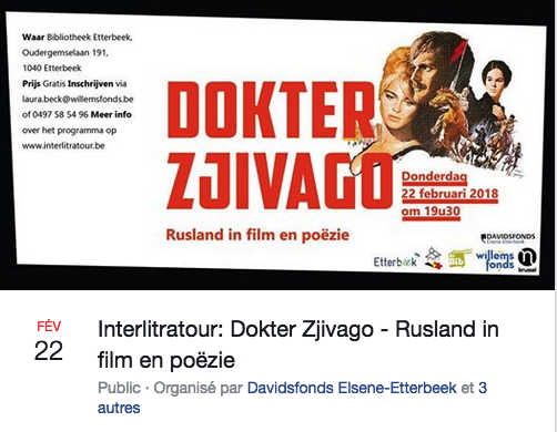 2 => Olga Mentchik op piano zingt « De stem van de wind » (Gent) 3 => Татарский национальный костюм (Saint-Josse) 3-4 => 9e Journées du livre russe et des littératures russophones (Paris) 4 => Ballet : The Lady of the Camellias (Kinepolis) 4,7,10,14,25 => ARINA Февральская афиша (Bruxelles) 5 => Conférence Michel De Grave. Compositeurs russes après 1917 (Woluwé-Saint-Lambert) 6 => Réception CCBLR New Year at Solvay (Bruxelles) 8 => Concert Vadim Piankov : « Le vol arrêté. Moscou-Luxembourg » (Luxembourg) 9 => Посольство Мастерства : Тимофей Доля и Роман Маркелов (Saint-Josse) 10 => Вечер-презентация литературного журнала « Берлин.Берега » (Francfort) 13,17,23,25 => Concert : une ballade finlandaise (Paris) 13 => Le nid de gentilshommes (Bougival) 14 => Концерт классической музыки « Валентинка » (Bruxelles) 18 => Dark Eyes. An evening of Russian and Gypsy romances (Ganshoren) 19 => Séminaire Aspects de l'Europe musicale chez Scriabine (Paris) 22 => Miroslav Kultyshev piano (Ixelles) 24 => Spectacle Вечер сплошного СМЕХова (Antwerpen) 27 => Entretien Andreï Gratchev, le prophète de l’avant-guerre (Bruxelles) 27 => Conférence Héléna Perroud. Un russe nommé Poutine (Paris) 28/2-4/3 => Excursion. В Ниццу на карнавал (Nice) Bibliographie : Épopée sibérienne. La Russie à la conquête de la Sibérie et du Grand Nord, par Éric Hoesli